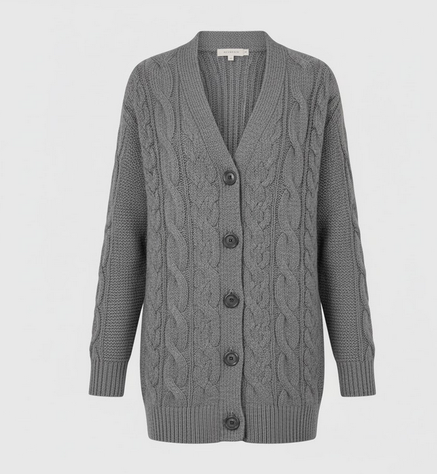 This long cardigan has a V-neckline with full-length sleeves. Made from acrylic knit, it showcases a 3D cable pattern and lantern sleeves, offering a relaxed outline suitable for casual autumn and winter wear.